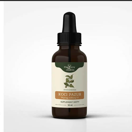 Magiczny Ogród Koci Pazur nalewka 1:1 Nanga 50 ml- Suplement diety. Jako surowiec zielarski wykorzystuje się wewnętrzną korę. Obfituje ona w wiele składników biologicznie czynnych – są to alkaloidy oksoindolowe pentacykliczne i tetracykliczne, glikozydy, triterpeny, flawonoidy, fitosteroidy i katechiny.